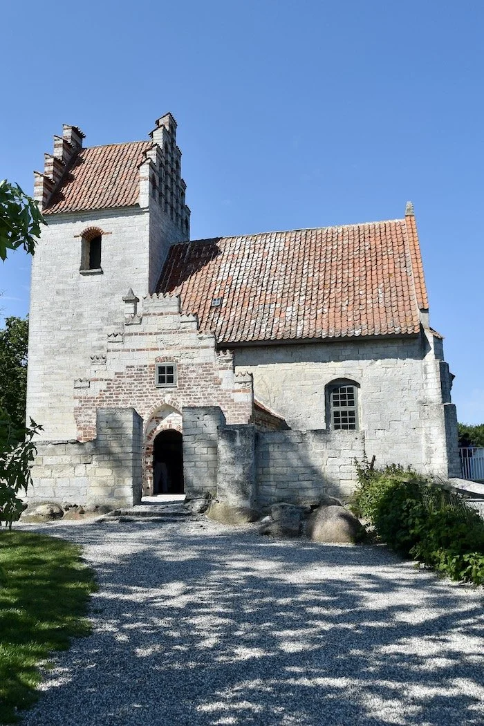 Fourteen kilometers (9 mi) north of Rødvig on a high field, sits Gjorslev Slot, a cruciform medieval castle begun in 1396 by the Bishop of Roskilde, Peder Jensen Lodehat, an adviser and friend (or more) to Queen Margaret I. Built of limestone from the cliffs and surrounded by a moat, it is one of the best preserved secular Gothic buildings in Denmark. For over 600 years, this agricultural estate has played important roles in Danish history, from a negotiation site to avoid war with the Hanseatic League to royal expropriation during the Reformation through numerous ownership changes. Now, private owners open for tours several times monthly.