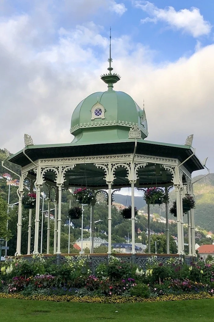 Needed rest stop- happening upon Bergen’s Engen park, which is close to the harbor, and finding an inviting bench near the ornate bandstand and lush flower borders.