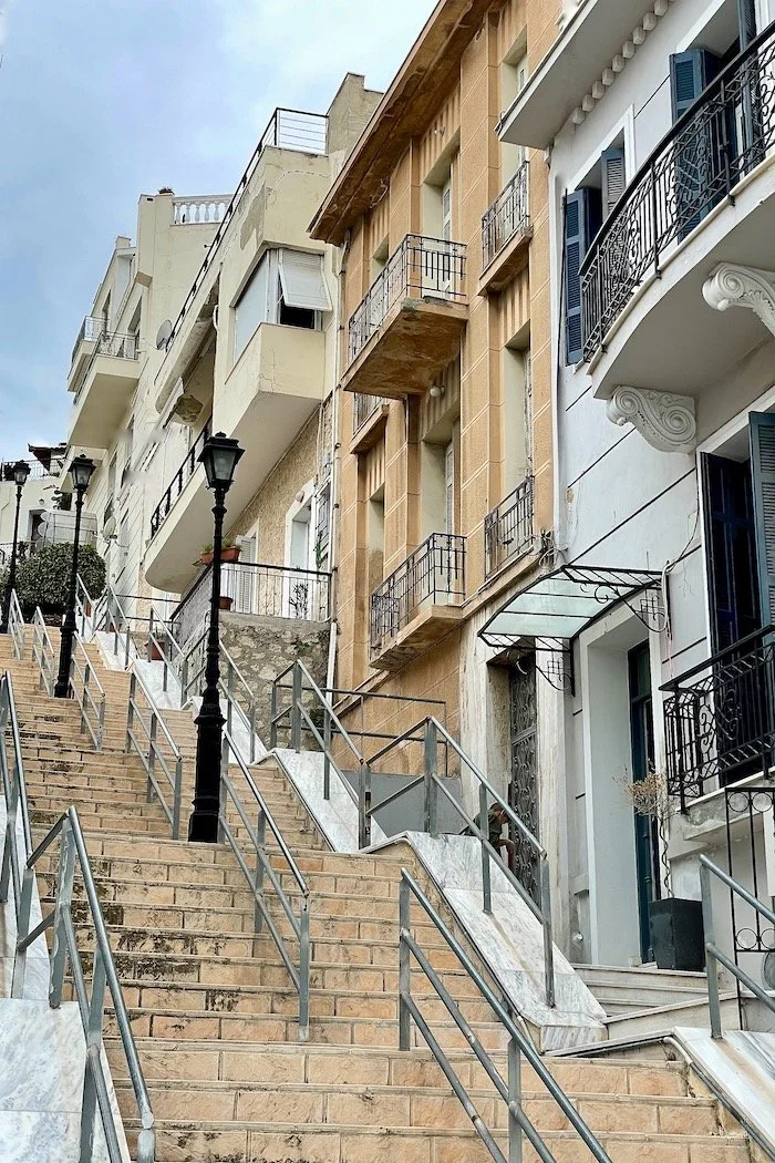 Votsalakia Beach, between Zea and Microlimano harbors, has both an organized beach with chairs and umbrellas, and plenty of free space where locals come to take an evening dip near football (soccer) fields and swimming pools. On the hilltop above, a climb up many steps, the authentic neighborhood of Kastella is known for the Elijah Church that crowns the hill. One of the prettiest parts of the city, the narrow streets give this neighborhood the feel of an island offshore, with its brightly painted houses among small shops, cozy cafes, and nighttime discos where young, hip locals come for fun.