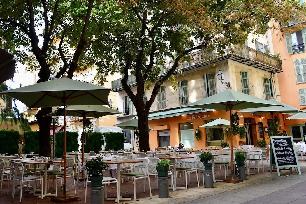 Brasserie L´F at the Marché au Fleurs with a view through arches to the Mediterranean for traditional moules frites or a charcuterie plate.