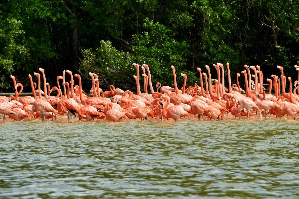 Celestún is a quiet fishing town that relies on mainly octopus hunting and the salt that it has produced since pre-Columbian times. Fine beaches line the ocean side, while the Celestún river and the like-named Biosphere Reserve surround the rest of the area. The wildlife sanctuary is home to numerous waterfowl species including heron, cormorant, pelican, and spectacularly, the up to 40,000 flamingos that migrate here to breed in the winter months. Mangroves surround this Gulf of Mexico inlet, also providing a home for alligators and a hatching ground for sea turtles. Freshwater springs bubble up along the edges of the river making swimming here a pleasure and producing this unique ecosystem by combining freshwater with the saltwater Gulf.