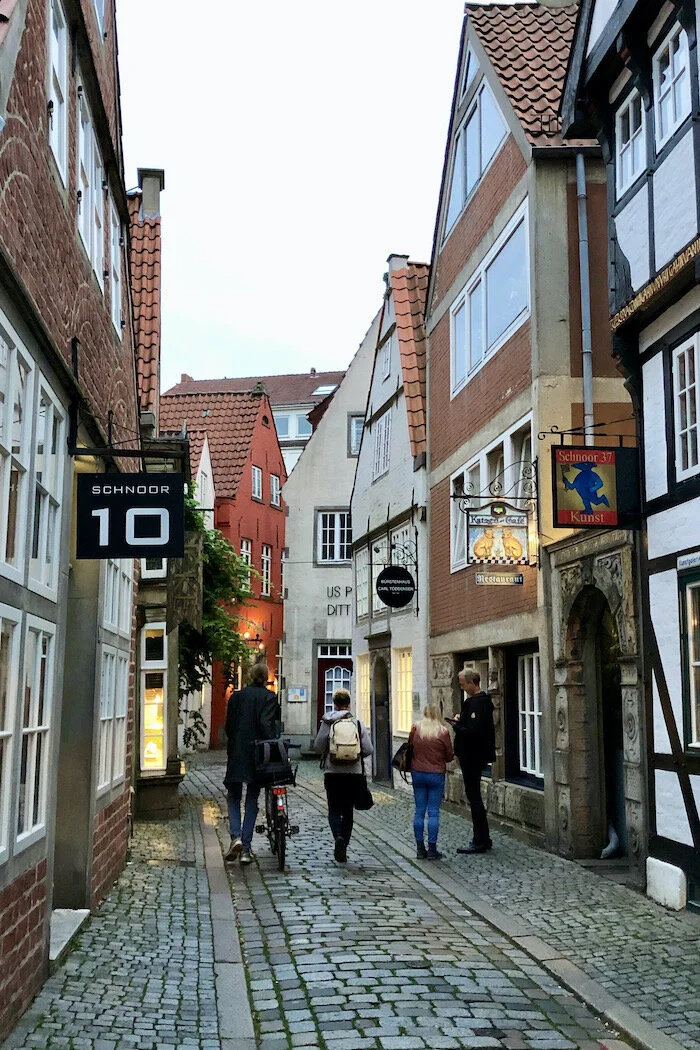 The two statues on Market Square are as central to Bremen’s story as the Hanseatic buildings: the huge Roland depicts a mythological knight who symbolizes Bremen’s free city status; and around the corner from Town Hall, the bronze sculpture of four animals from the Grimm’s Brothers fairytale, The Bremen Town Musicians, has become the city’s unofficial coat of arms. Tucked between the Market Square and the Weser River, Böttcherstrasse, or Cooper’s Street, is a narrow lane of brick expressionist buildings rescued in the 1920s by the coffee magnate and inventor of decaf coffee, Ludwig Roselius. Chic shops, galleries, bars, and craft ateliers now adorn the street leading to the Glockenspiel House. There, the thirty Meisen porcelain bells adorning the building’s gabled brick facade play old sea shanties twice daily. The nearby Schnoor Quarter, located on the riverside, is Bremen’s oldest neighborhood. From its first development in the 10th century and for centuries thereafter, the area housed poor fishermen and ship’s rigging makers, giving the district its name, which means line or string.