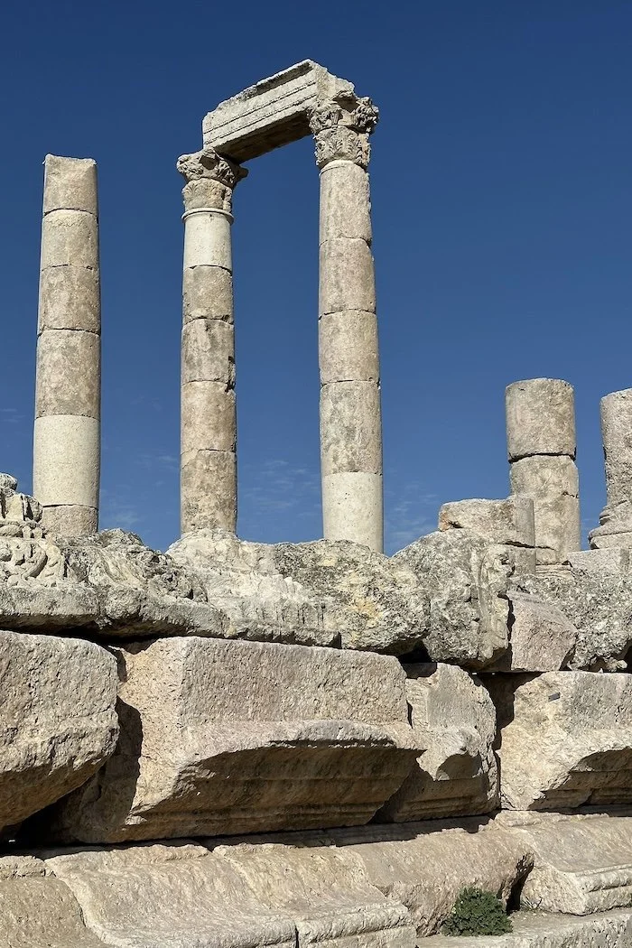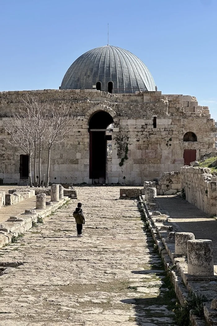 It's another uphill walk to the Citadel, perched atop Jabal al-Qala’a hill, an open-air museum inviting visitors to wander among the ruins of numerous civilizations. Inhabited since the Bronze Age, settlement continued through the Iron Age, Persian, Hellenistic, Roman, Byzantine, and Arab Muslim periods. The complex’s National Archeological Museum houses extraordinary artifacts, and outdoor Citadel notables include pillars of the Roman Temple of Hercules, the 8th-century Umayyad Palace complex, known for its grand dome, and a Byzantine Basilica. Views of the city in all directions include the new, eye-catching King Abdullah I Mosque with its blue-tiled dome, in the distance.