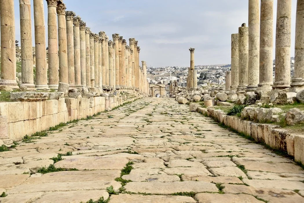 Outside Amman, two recommendable daytrips go to Ancient Jerash, and Madaba and Mount Nebo. The latter is where Moses saw the Promised Land, and the views are astonishing. In the mosaic city of Madaba, the Greek Orthodox St. Georges Church has preserved an intricate Byzantine mosaic map of the area covering the church floor. Jerash, known through the ages as Jericho, Antioch, and Gerasa was founded during the 4th century BCE. The city of one thousand columns rivals Turkish Ephesus and Italian Pompeii. The amazing remains include a magnificent oval plaza forum, large and small theaters, temples to Zeus and Artemis, and the longest Roman Cardo (main street) lined with columns, sidewalks, shop stalls, and a drainage system.