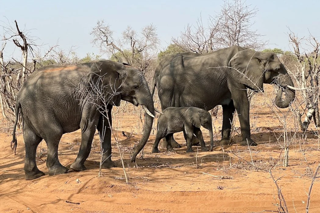 The awe-inspiring landscapes of desert, delta, and grasslands protect some of Africa’s largest wilderness, home to a rich range of wildlife. The Chobe National Park contains the world’s largest concentration of African Elephants. They can be observed by boat on the Chobe River, which forms the border at the Four-Country Corner. There, the elephants share water and islands with water buffaloes, hippos, giraffes, alligators and many bird species including African eagles, and Marabou storks, one of the Ugly Five. Seen on land from rugged jeeps, the elephants amble peacefully past herds of impala, grazing kudus, banded mongooses, fast-moving baboon troops, lazy prides of resting lions and bashful giraffes. High up in Zambezi teak trees, vultures, another of the Ugly Five, wait.