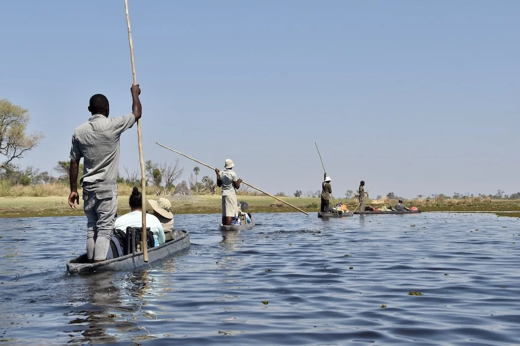 In the Okavango Delta, the world’s largest inland delta, changes of transport can be desirable or necessary. This semi-forested wetland, crucial for animals and man, is a World Heritage Site. Flying over the delta in a small craft is an awe-inspiring experience. So is silently gliding through delta waters in a “mokoro” canoe steered by a local poler, past water lilies and salvinia weed on the way to a bush camp. Temperatures in the delta advise early morning and late afternoon bush walks to see herds of zebra, more grazing giraffes and elephants, twisted-horned elands, and a variety of water birds, including blue and white storks, and red African jacana.