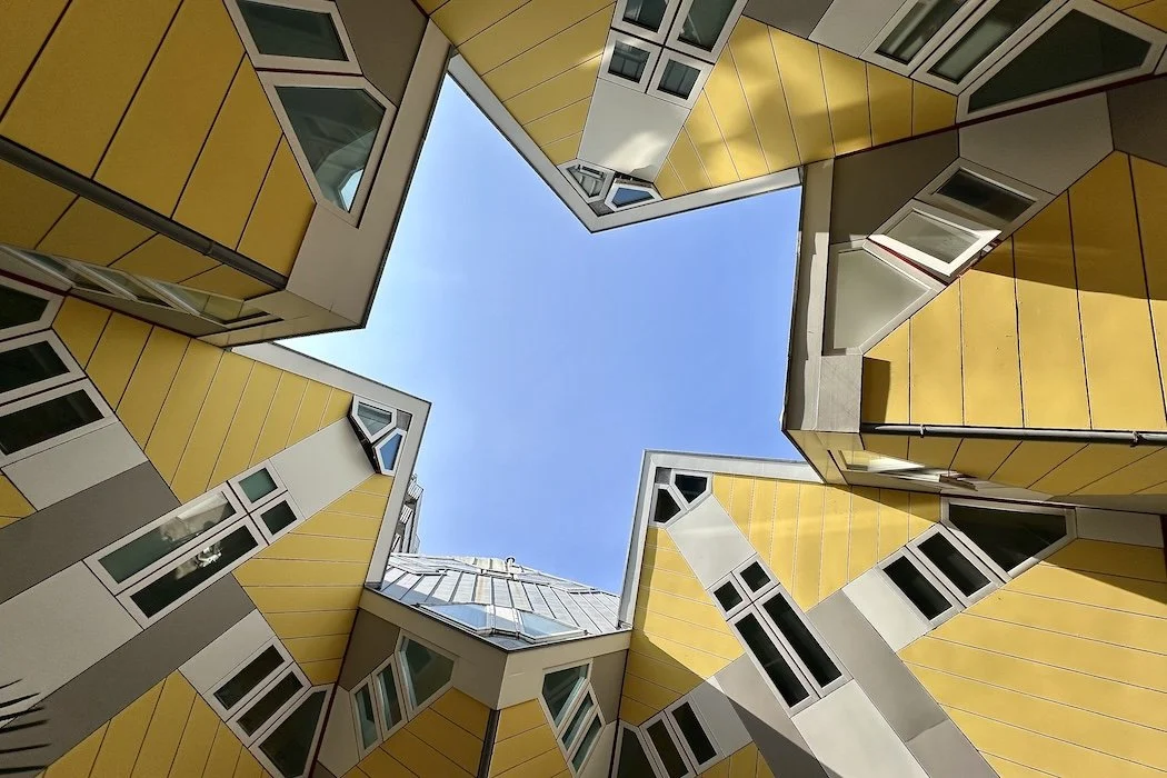 In the Stadsdreihoek area, the sleek stone and glass-arched Markthal building is colorful inside, yet reminiscent of lively southern European markets. The open-air market takes place on Tuesdays and Saturdays outside on Binnenrottenplein. Across the square, the bright yellow, still-occupied Cube Houses Kubuswoningen, a cool 1980s design by Piet Blom, were built as a village in the city, and one is open for visitors to appreciate the many-angled spaces. Nearby, Great St. Lawrence Church’s Gothic tower was badly damaged during the bombing of Rotterdam and now stands restored. Past the Buersplein shopping street, on the Museumstraat in Centrum, the fascinating Depot Boijmans van Beuningen is an art depot cum museum in a shiny modern building where it’s possible to watch restoration projects in process, visit the rooftop restaurant, or watch the sun set on the façade.