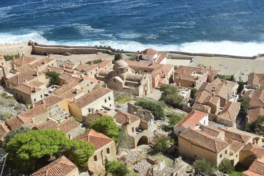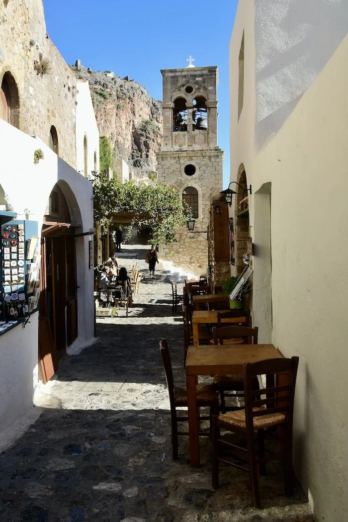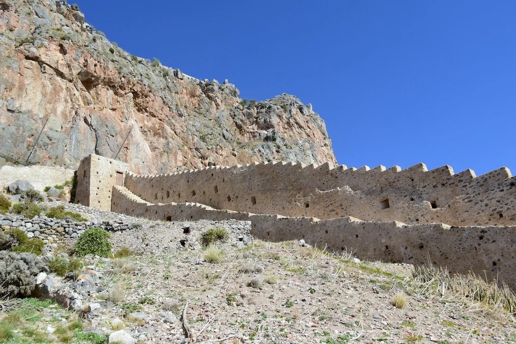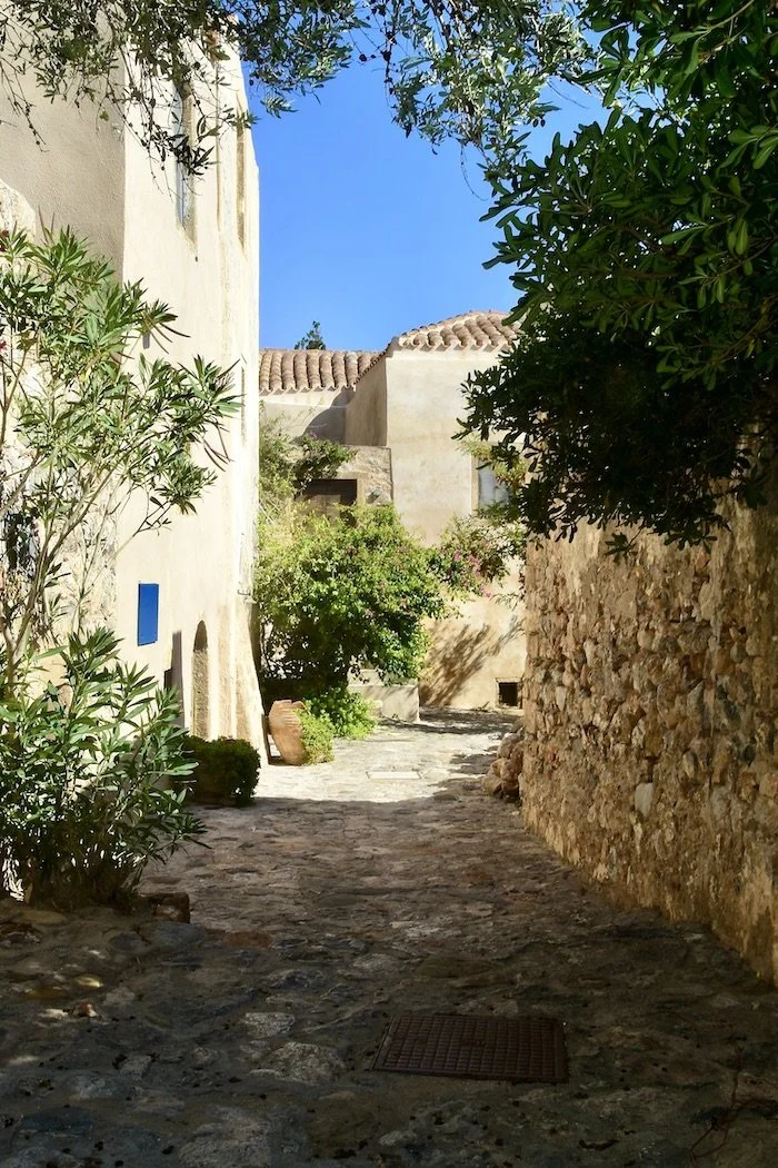 As in Naflpio in the northern Peloponnese, having an upper and a lower town means walking a lot of steps. The Upper Town, the former Citadel located on top of the rock, is reachable via Voltes, a stepped zigzagging path, and through the central gate. Once surrounded by a wall with towers, rifle eyelets, cannon portals, and sentry posts, it was an impregnable town and bastion that is now completely uninhabited. This Byzantine citadel was adapted by later Venetian and Turkish rulers, who also left ancient remains, including rocky, twisting roads, mansions, a hammam bathhouse complex from the second Turkish rule, and the Agia Sofia Church, which was twice converted to a mosque. Besides, wandering to the acropolis and admiring the church interior, the top of the rock affords fantastic views of the surrounding mainland and the Lower Town.